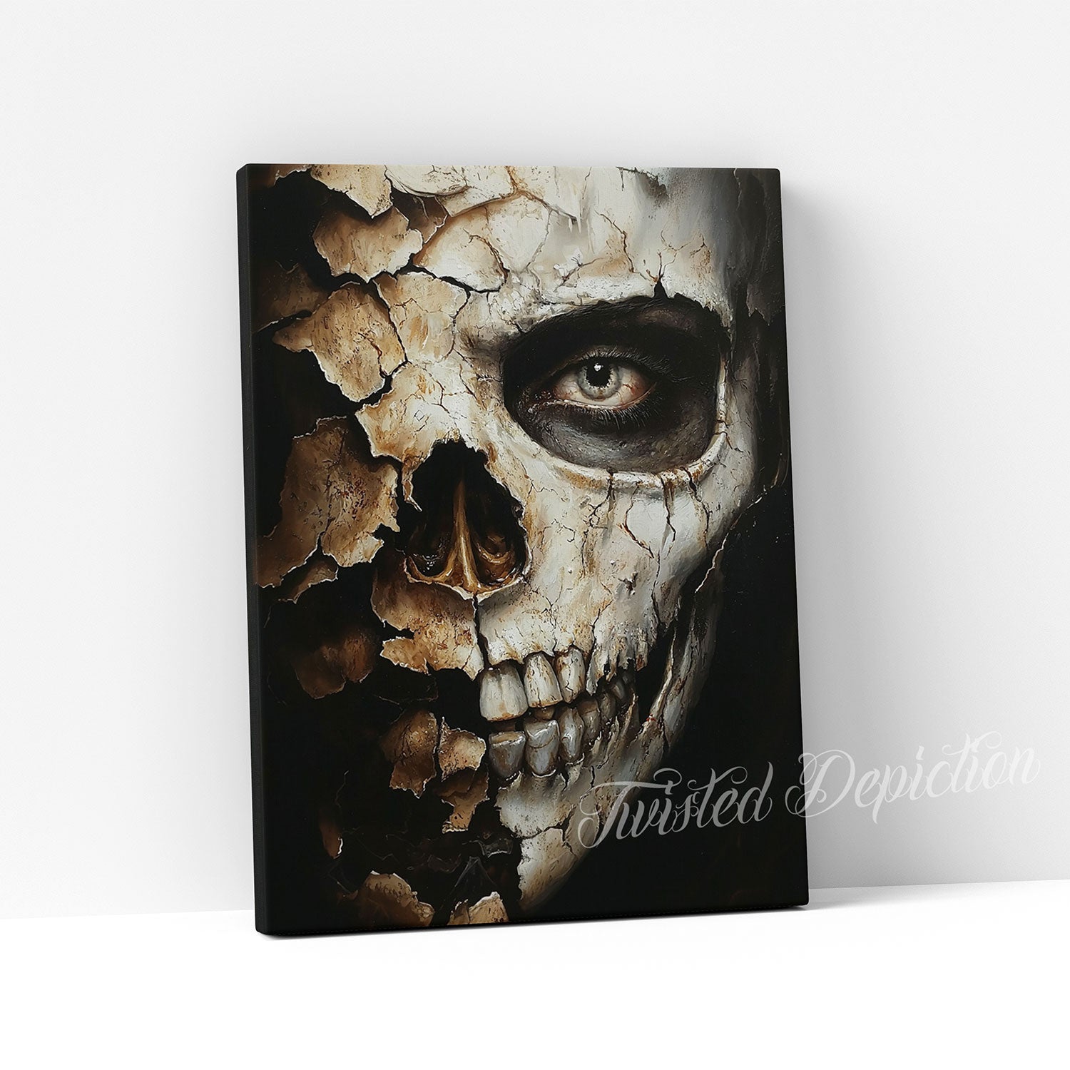 Fractured Skull presents a shattered visage haunted by a peering eye that emerges from shadow below. This creepy painting merges skeletal imagery with psychological dread, creating an atmosphere of unrelenting surveillance and decay. Perfect for collectors who embrace unsettling art.