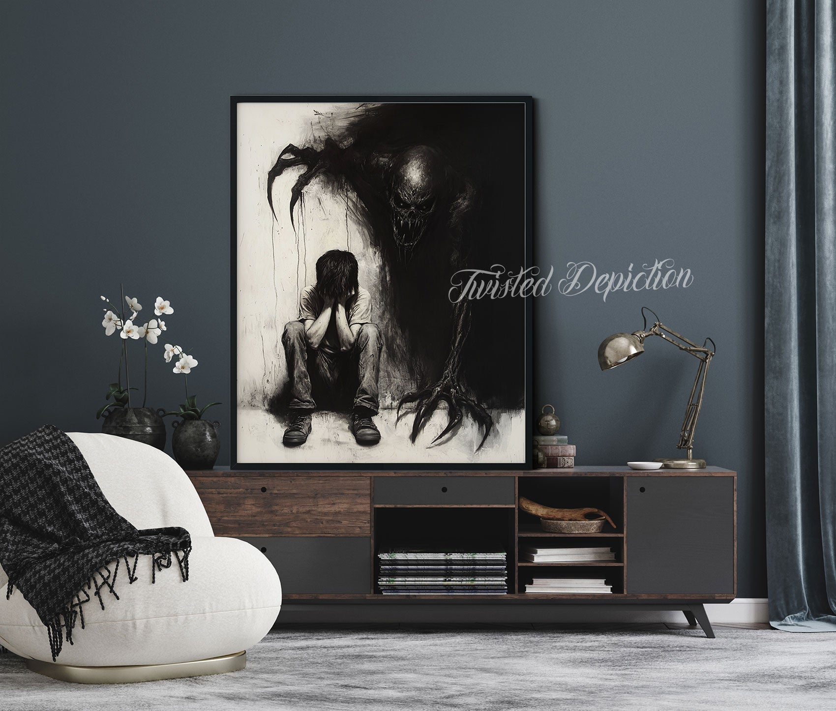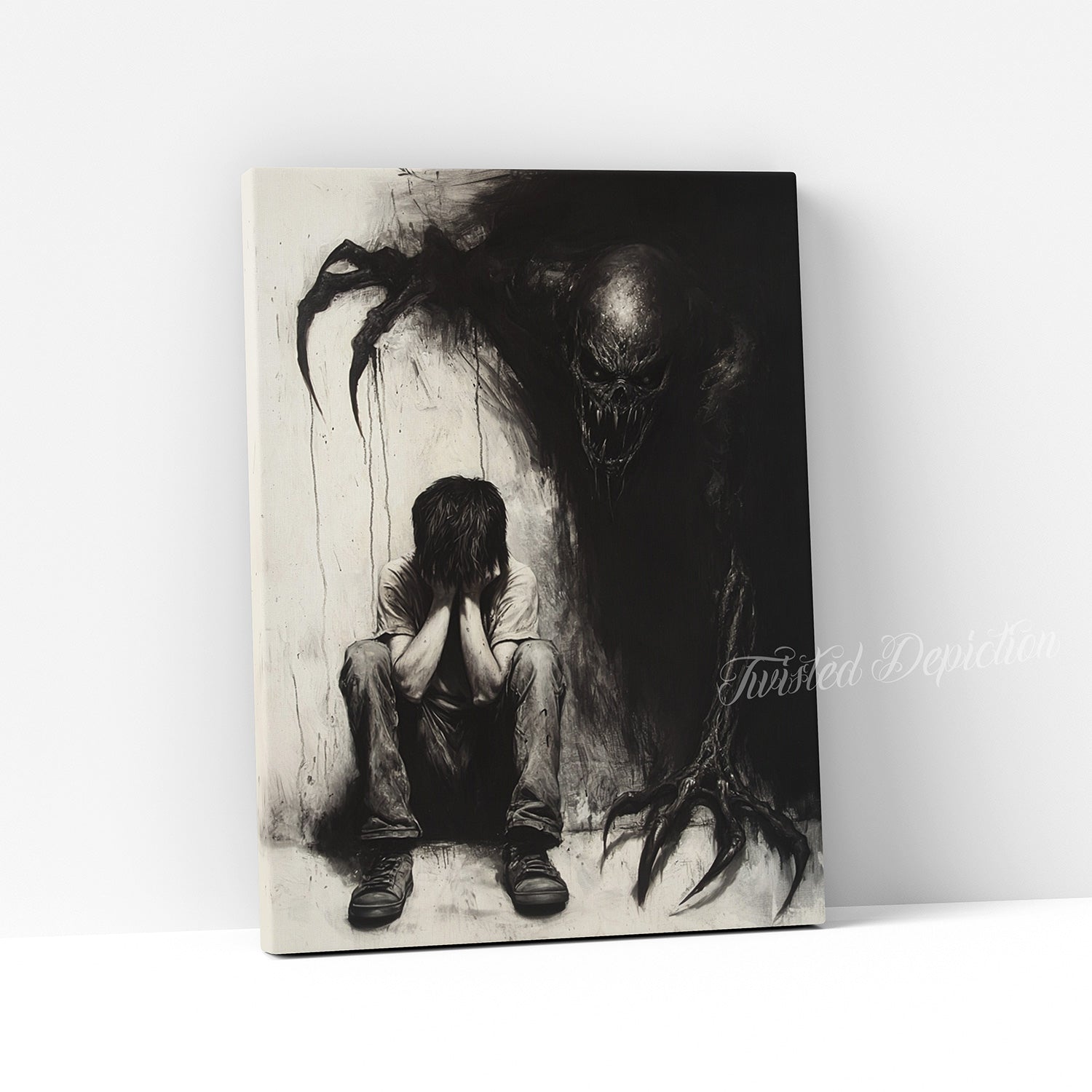This wall art embodies the relentless weight of demons that linger. "Childhood Trauma" speaks to the quiet despair of unresolved wounds, the ghosts that follow us through empty rooms. For those who understand that some shadows never fully fade.