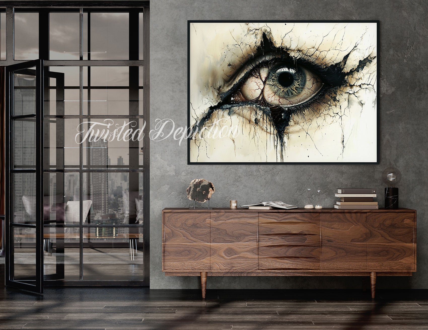 Cracks of Flesh - Eyeball reveals a chilling scene of an eyeball forcefully emerging through a fractured wall of flesh. This morbid painting embodies raw horror and visceral detail, perfect for those who embrace unsettling, twisted art that provokes thought and unease.